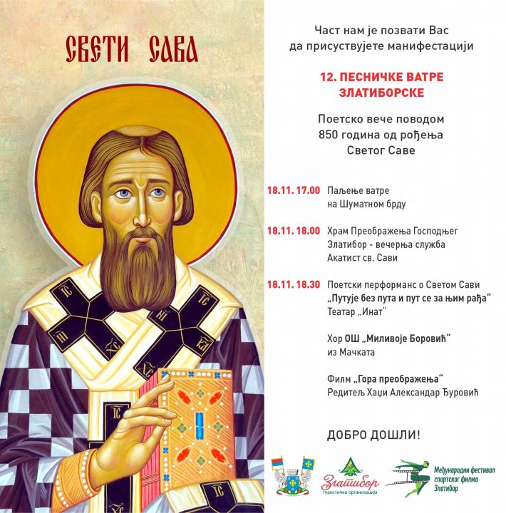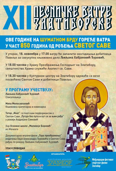 Tradicionalna manifestacija „Pesničke vatre zlatiborske“ u čast 850 godina od rođenja Svetog Save biće održana u utorak 18. novembra. Program će početi paljenjem vatre na Šumatnom brdu u 17 časova, kada će vatru zapaliti ovogodišnja dobitnica Povelje „Pesničkih vatri zlatiborskih“ za sveukupno književno delo,spisateljica LJiljana Habjanović Đurović.