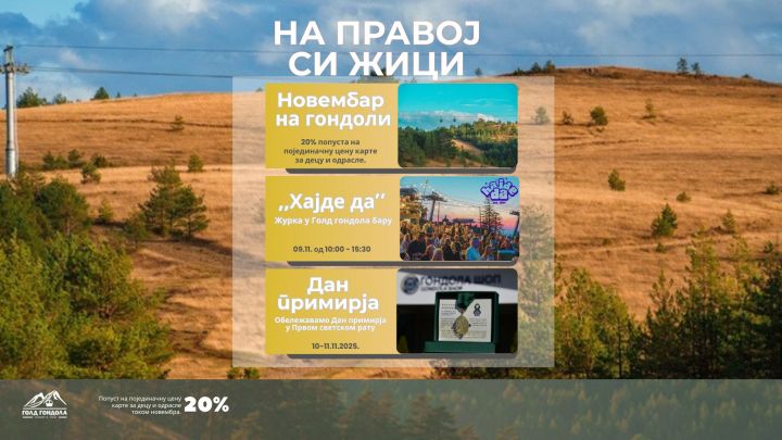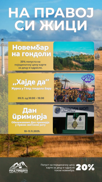Tokom celog novembra uživajte u vožnji Gold gondolom uz 20% popusta na pojedinačne karte. Iskoristite priliku da Zlatibor doživite iz najbolje perspektive - mirnije, tiše i povoljnije nego ikad