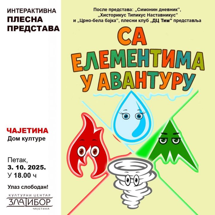 Interaktivna plesna dečja predstava ,,Sa elementima u avanturi" biće izvedena u petak, 3. oktobra u Domu kulture u Čajetini, a u subotu 4. oktobra, u Kulturnom centru na Zlatiboru, obe u 18 časova.