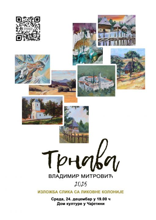 U sredu, 24.12.2025. godine, u Domu kulture u Čajetini biće otvorena izložba slika sa 33. Likovne kolonije „Trnava -Vladimir Mitrović".