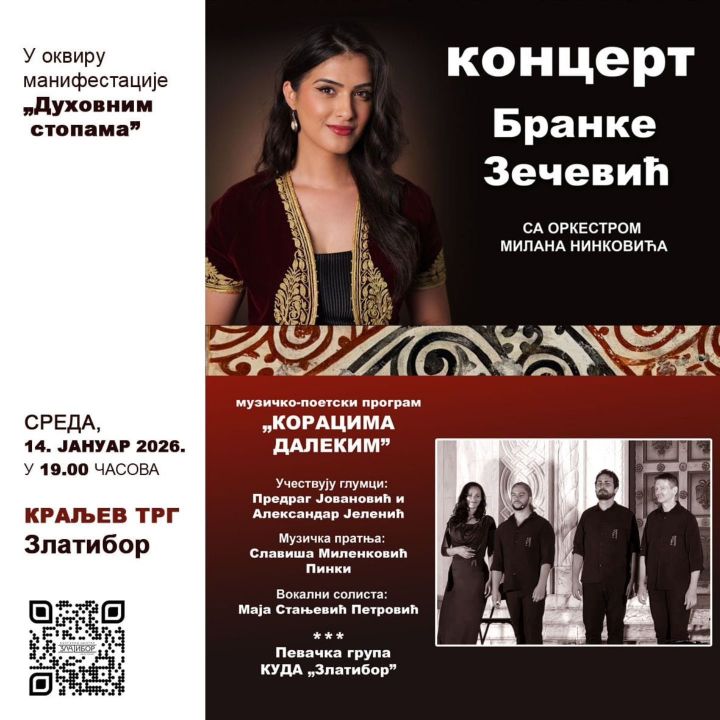 U okviru manifestacije „Duhovnim stopama", na Kraljevom trgu na Zlatiboru, u sredu, 14. januara, od 19 časova biće održan koncert etno-pevačice Branke Zečević uz orkestar Milana Ninkovića.