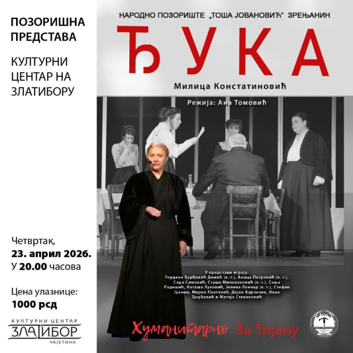 Pozivamo vas na izuzetan kulturni i humanitarni događaj koji će se održati u četvrtak, 23. aprila u 20 časova, kada će na sceni Kulturnog centra „Zlatibor” gostovati Narodno pozorište „Toša Jovanović” iz Zrenjanina sa predstavom „Đuka”.