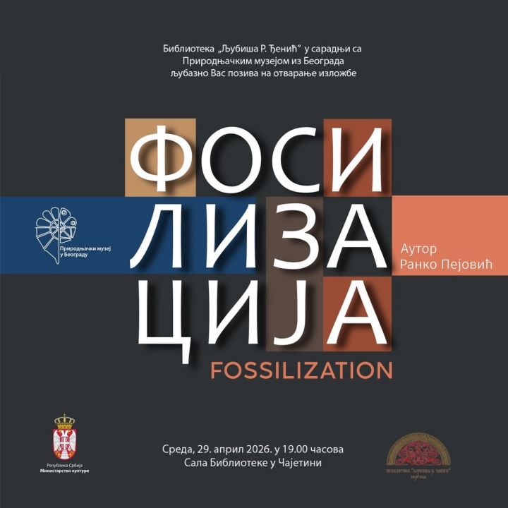 Biblioteka „LJubiša R. Đenić” u saradnji sa Prirodnjačkim muzejom iz Beograda poziva vas na otvaranje izložbe „Fosilizacija” autora Ranka Pejovića u sredu, 29. aprila u 19.00 časova u Svečanoj sali Biblioteke u Čajetini.
