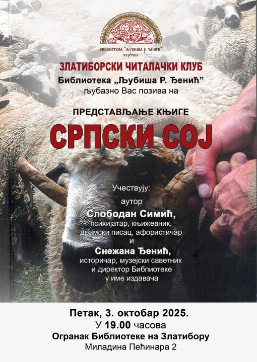 U petak, 3. oktobra od 19.00 časova u Ogranku Biblioteke na Zlatiboru održaće se promocija knjige autora Slobodana Simića „Srpski soj“.