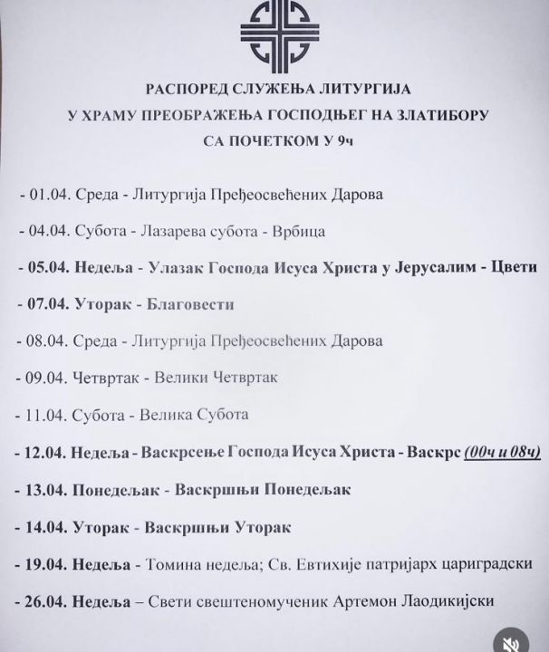 Raspored služenja liturgija u Hramu Preobraženja Gospodnjeg - APRIL 2026.