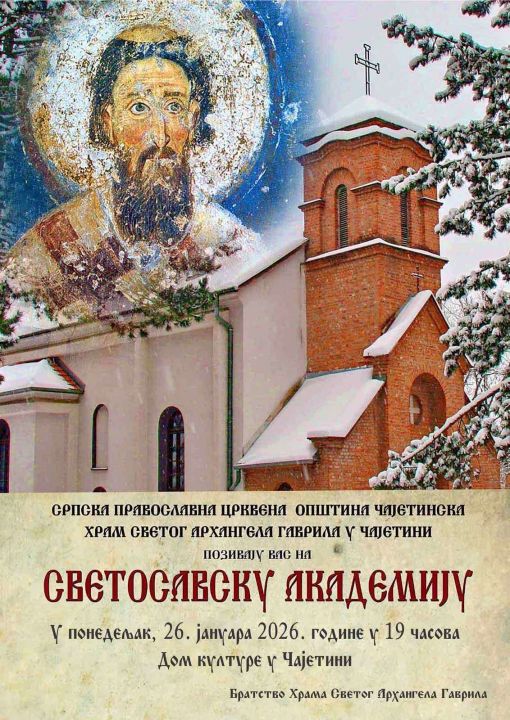 Srpska pravoslavna crkvena – opština čajetinska, Hram Sv. Arhangela Gavrila, organizuje Svetosavsku akademiju u ponedeljak, 26. januara u Domu kulture u Čajetini.